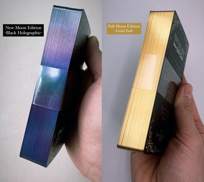 The Full Moon Edition comes in an elegant and beautifully done Gold Foil Edging. Creating more shine and shimmer, perfectly. Matching the deck. This gives the deck a very regal and almost Victorian energy and style.